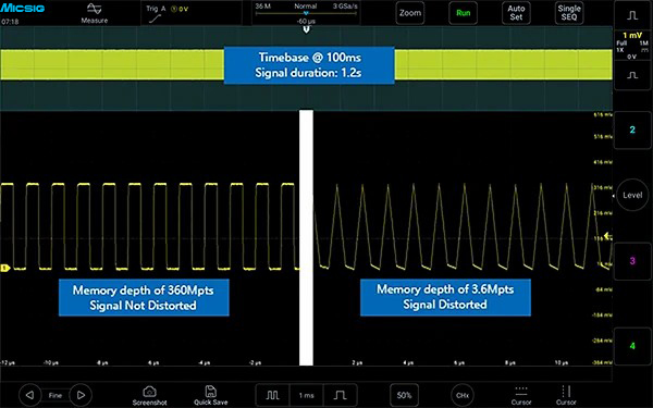 Com uma profundidade de memória de 360Mpts, mesmo quando dois canais estão ativos simultaneamente, não há redução na capacidade de armazenamento, garantindo excelente fidelidade de sinal em grandes bases de tempo.